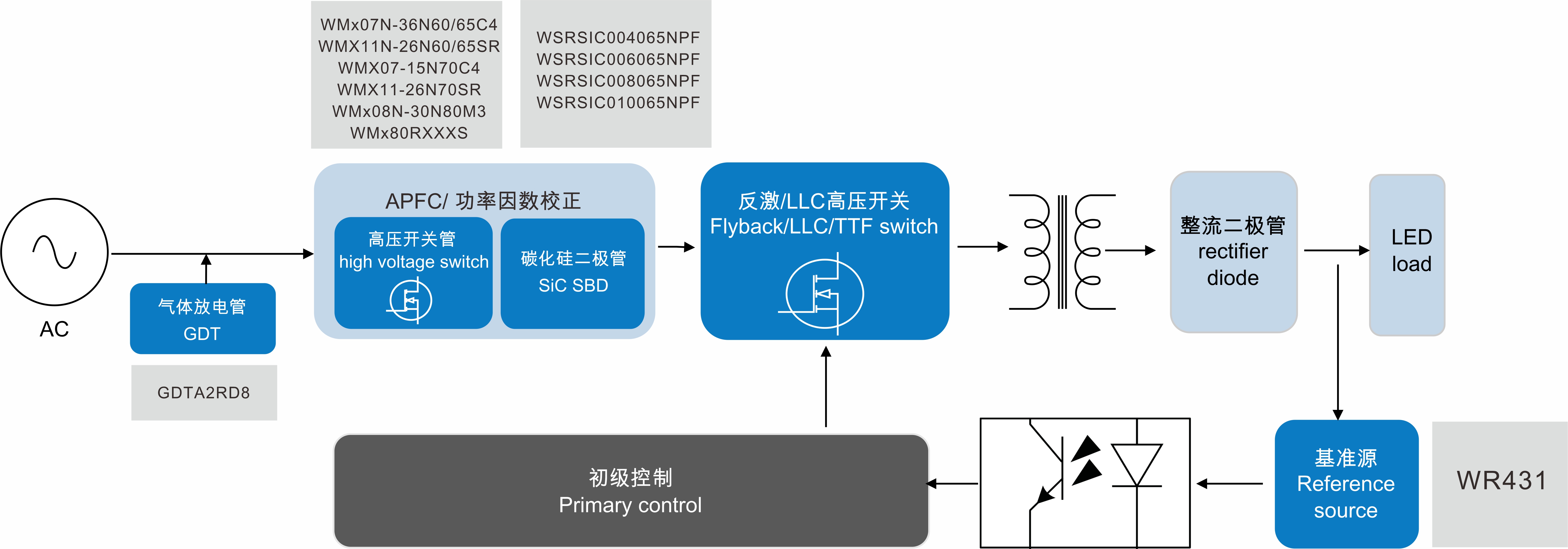 | LED照明驱动电源 | 高压开关管 | WMx07N-36N60/65C4 ,WMX11N-26N60/65SR ,WMX07-15N70C4 ,WMX11-26N70SR ,WMx08N-30N80M3 ,WMx80RXXXS | TO-223, TO-252, TO-220F, TO-247, | 1Ω-0.07Ω, 650V-800V |