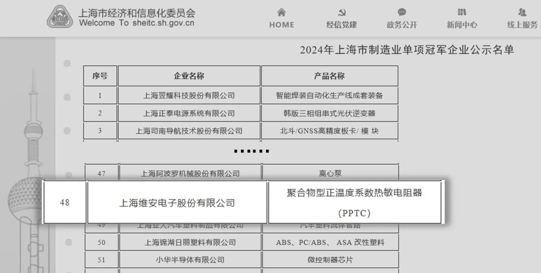 近日,2024年上海市制造业单项冠军名单由上海市经济和信息化委员会正式公布。上海维安电子股份有限公司凭借其卓越的市场竞争实力和优秀的自主创新成果,成功脱颖而出,荣获此项荣誉。