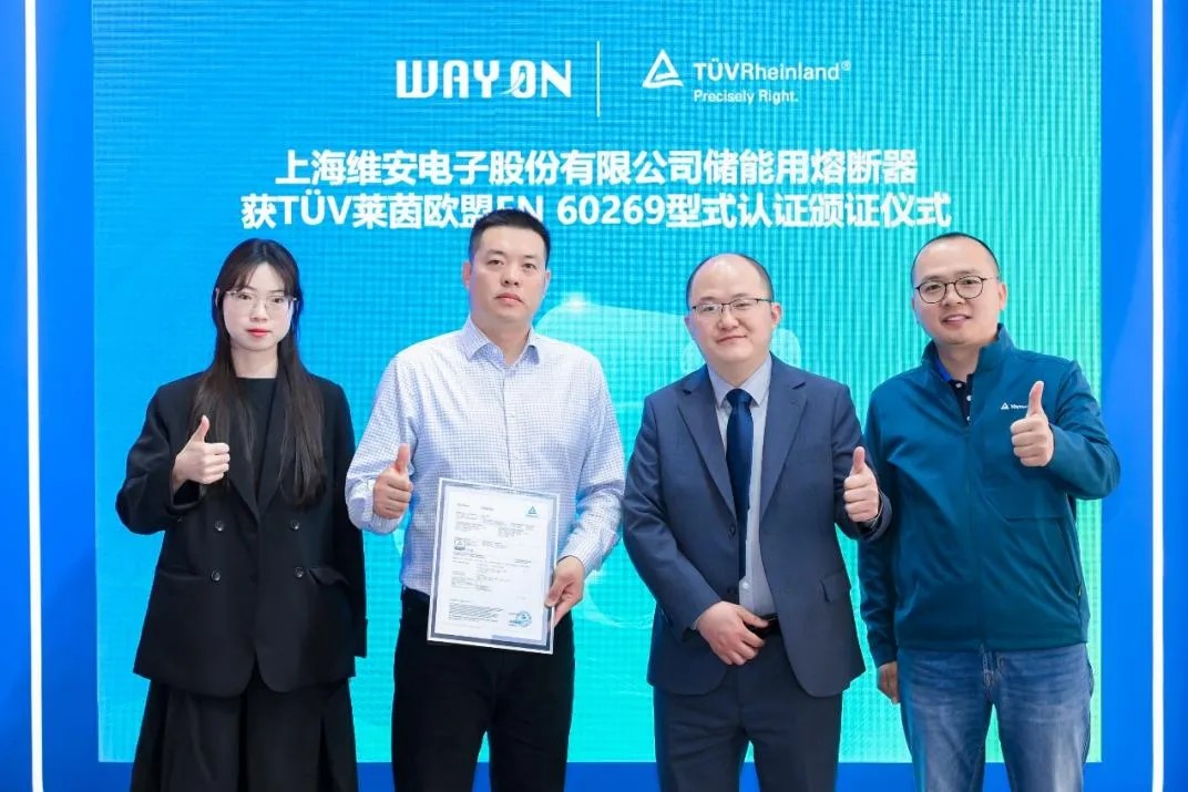 近日,在第十三届储能国际峰会暨展览会(ESIE 2025)期间,德国莱茵TÜV大中华区(以下简称“TÜV莱茵”)为上海维安电子股份有限公司(以下简称“维安”)的储能熔断器产品颁发了EN 60269标准认证证书。