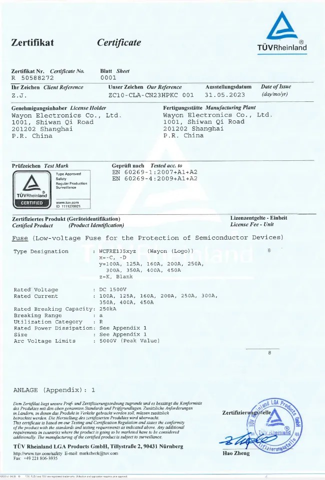 EN 60269标准作为熔断器产品安全性能评估的核心依据,被TÜV莱茵严格贯彻于产品检测中,本次维安储能熔断器产品经全面测试与评估,在电气性能和安全性能两大维度均达到国际标准要求,成功斩获认证。