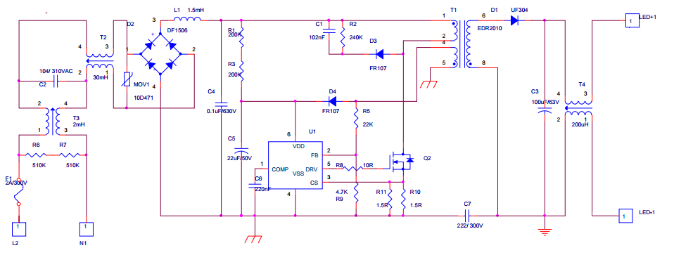 LED作为新型照明光源,具有高效节能、工作寿命长等优点,目前已广泛使用于LED显示、车用电子、生活照明等各种照明场景。LED恒流驱动特征需要特定的AC-DC恒流驱动电源,为了提高电源能效,LED的驱动电源一般采用单级PFC的拓扑。