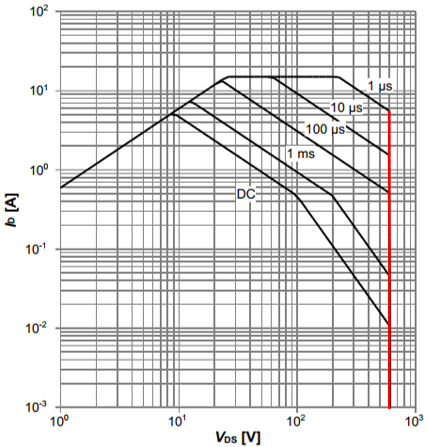 雪崩是指MOSFET上的电压超过漏源极额定耐压并发生击穿的现象。图二为600V MOSFET的安全工作区示意图,图中红色标线为安全工作区的右边界。雪崩发生时,漏源两端的电压超过额定BVDSS,并伴随有电流流过漏源极,此时MOSFET工作在此边界的右边,超出安全工作区(SOA)。