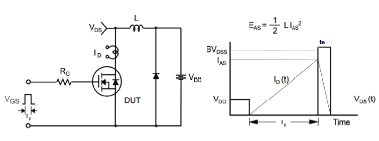 如图三所示雪崩测量电路及波形,一旦超出安全工作区,MOSFET功耗将大增。左图为雪崩测试的标准电路,右图为雪崩期间的运行波形。MOSFET在关断时因VDS电压过高而进入雪崩状态,雪崩期间漏源极电压电流同时存在,其产生的瞬时功耗达到数KW,会大大影响整个电源的可靠性。且雪崩期间,必须保证其沟道温度不超过额定沟道温度,否则容易导致器件过温失效。