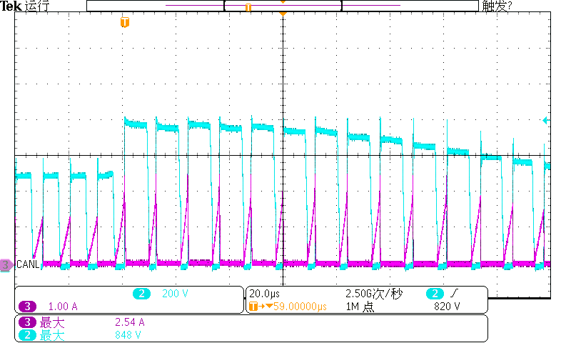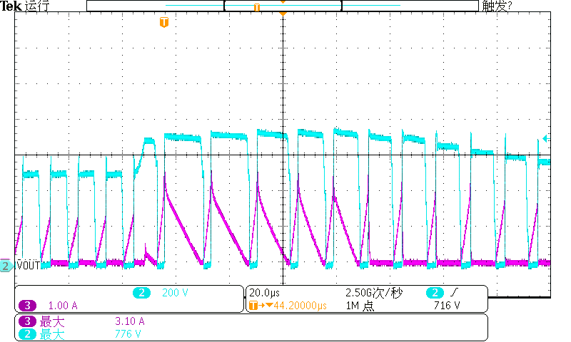 图四为使用耐压为800V MOSFET的LED驱动电源在浪涌发生的波形。图五为耐压为650V MOSFET的50W LED驱动电源在浪涌发生时的波形,二者的浪涌测试条件完全相同。