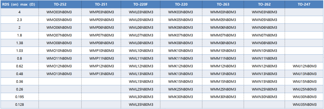 上述表格中,03N80M3,05N80M3可以应用在浪涌要求较高的辅助电源中,比如工业380VAC输入的3-5W辅助电源。相比650V规格,其浪涌能力明显提高;相比平面工艺的2N80规格,导通电阻明显降低,温升和效率性显著提升。