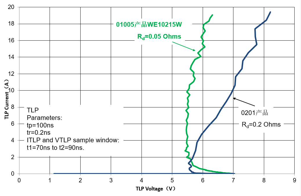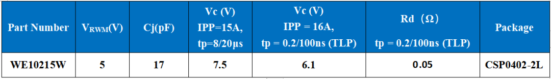 选取一款与之电容相近的类似规格的0201尺寸产品进行浪涌能力对比测试,可见WE10215W极限IPP较0201产品提升1.5倍,钳位电压较0201产品低1.5V。