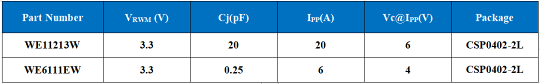 作为便携电子设备不可或缺的保护器件,TVS器件肩负着静电保护和浪涌电流泄放的工作,也有小型化的“任务”。在某些设计方案中,即使0201尺寸(0.6mm*0.3 mm*0.3mm)也被设计师“嫌弃”太大太厚。为此维安(WAYON)采用WLCSP封装技术,推出了01005尺寸(0.44mm*0.235 mm*0.125mm)超小型封装体积系列产品,也是国内最薄TVS产品。满足小型化的同时兼顾参数性能:±30kV的静电防护能力、浪涌IPP 15A、钳位电压7.5V,TLP设备测试IPP=16A时,钳位电压6.1V,导通阻抗Rd 0.05Ω,可用于低速数据端口和电源端口。
