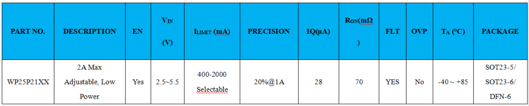 维安WP25P21XX系列产品输入电压为2.5V~5.5V,可调电流限制范围在0.4A~2A之间,导通电阻70mΩ,28μA的静态功耗,主要封装形式为SOT23-5/6和DFN-6封装,可以满足小空间、低功耗产品的应用场景。
