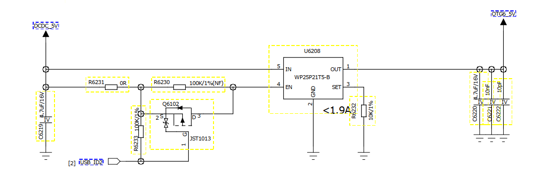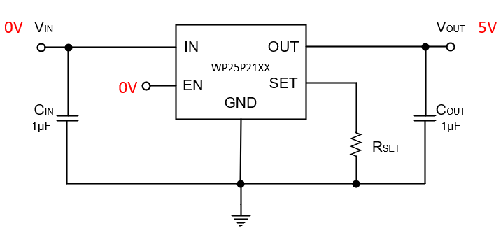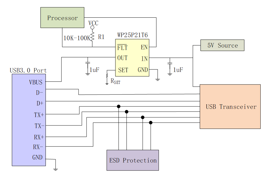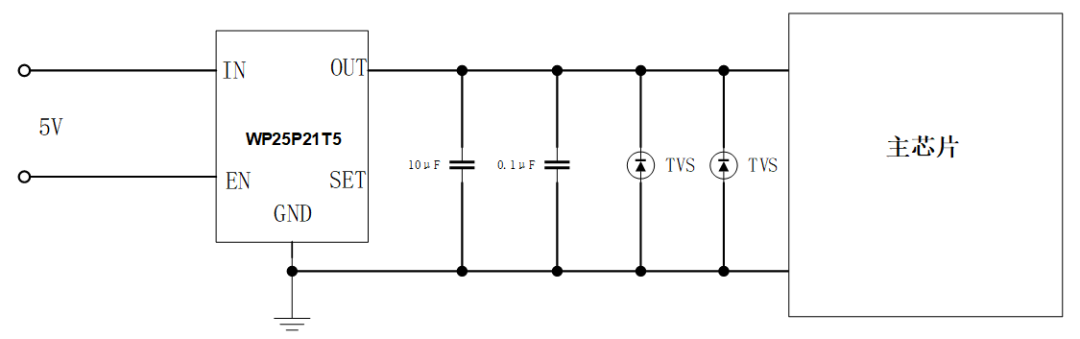 在使用时,WP25P21XX系列产品通常用于USB接口和内部电源之间,输入、输出引脚外接1µF的陶瓷电容,对USB接口接入的设备提供工作电流,在接入的负载发生过流现象时提供过流保护,使得USB接口能够安全可靠的工作。它可以保护和防止芯片内部功率器件免受大电流的冲击,加强电路带负载的能力。