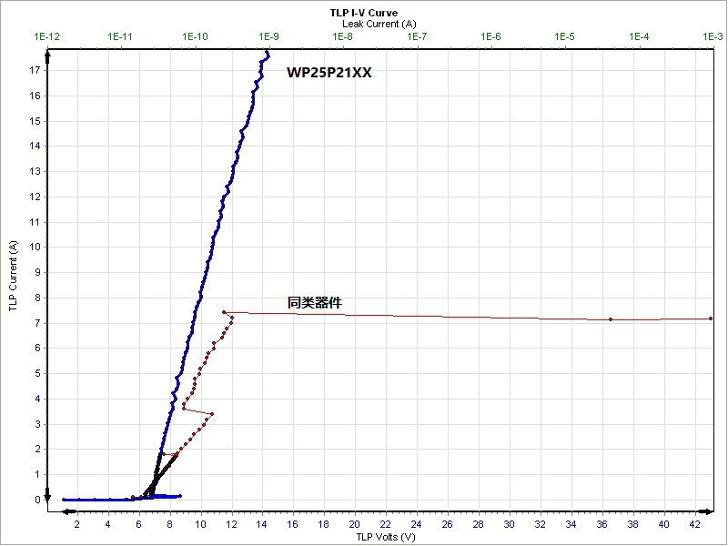 除超强的反向电流保护功能外,WP25P21XX系列产品相比于同类器件还具有更优的防静电能力,通过改进GGNMOS多指型结构不同指之间寄生BJT的trigger电压的均匀性,从而保证在第一个器件发生最终击穿前全部开启,实现所设计所有对应的BJT开启,实现电流泄放目的。经实测ESD(HBM)可达到8KV,完全满足用户实际使用中更为苛刻的使用环境。