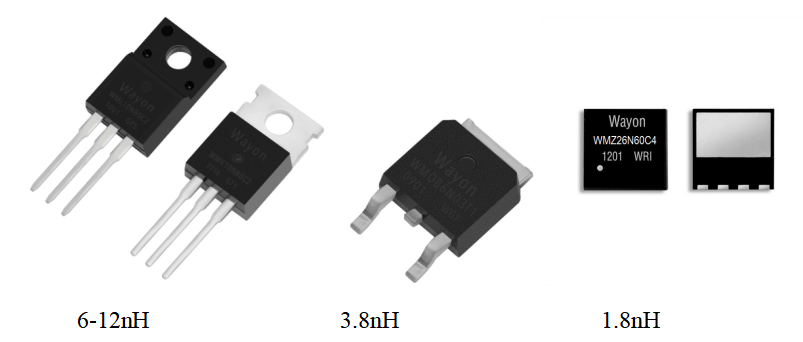相比传统TO系列直插和SMD器件,PDFN 无引脚器件引脚寄生电感非常小。此特征可以显著提高器件的开关速度。可以通过LTspice软件仿真验证。下图使用并联器件中模拟不同的寄生电感来对比器件开通和关断速度。