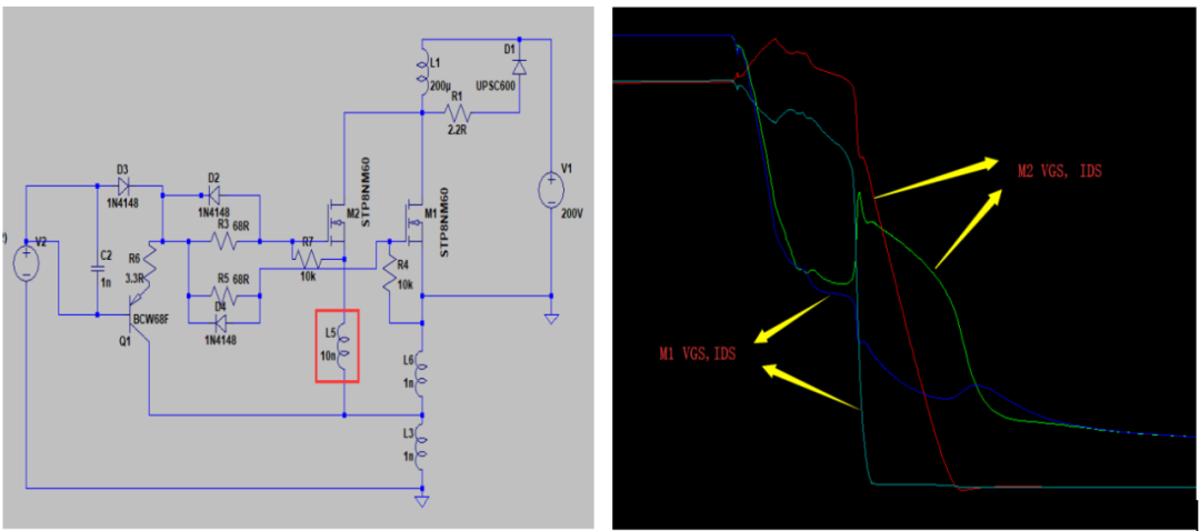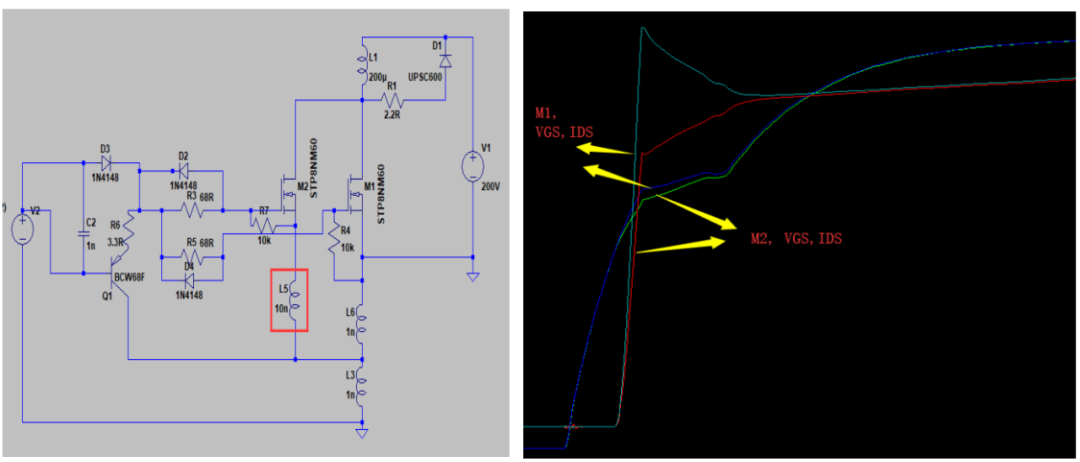 图6 不同源极(M2=10nH,M1=1nH)LTspice仿真开通波形图