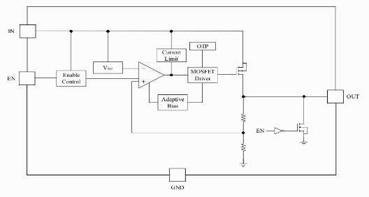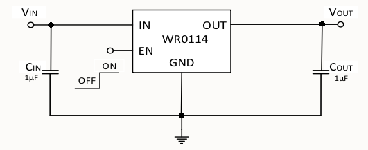 物联网、智能穿戴设备应用中,WR0114系列产品的输入、输出引脚电容须外接1µF的陶瓷电容。其EN引脚为供电模式控制,该引脚具备内部上拉电阻,当使能端悬空时亦能正常工作,当输入逻辑低电平时,其待机电流降至0.1µA。对于有苛刻功耗需求的可穿戴设备,该功能大有益处,能够大幅降低产品功耗,增强设计灵活性。