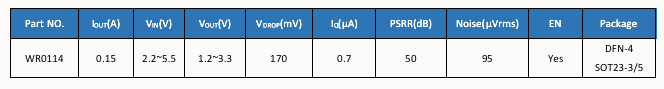 WR0114系列产品性能领先于国内绝大多数厂商的同类型产品,0.7uA(Typ)的超低静态功耗,待机功耗0.1µA(Typ),输出电流150mA,主要封装形式为小型化DFN-4(1*1)封装和常规SOT23-3/5封装,可满足小空间、极低功耗的产品应用场景。