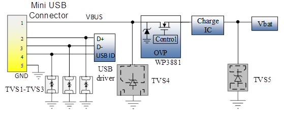 WAYON首创的单向骤回特性TVS产品具有通流能力强,钳位电压低的特性,对充电端口内部元器件有很好的保护作用。VBUS端口工作电压12V到30V不等,VBAT端的输出工作电压一般为4.35V~4.85V,不同的电池模块方案及其不同的测试应力条件下,需要提供能适应各种电源电压,以及配合OVP保护方案的TVS产品。而电池供电的音频、射频等PA耐受过电压能力较低,还需要TVS在电池输出过电压时有近似理想二极管的钳位电压。