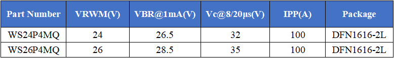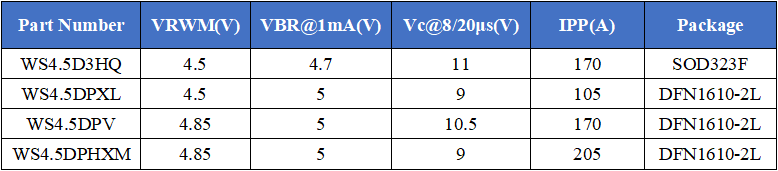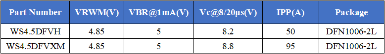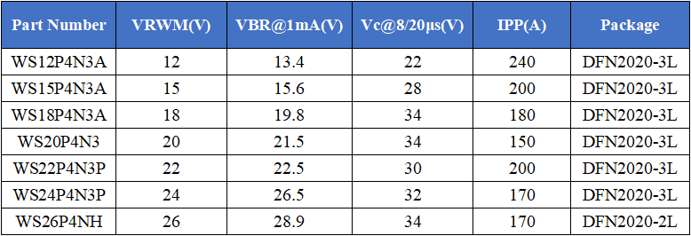 WS**P4N*及WS4.5DP*系列产品充分利用纵向NPN结构穿通击穿状态通流大、钳位电压低的特点与突变PN结正向导通钳位电压低的优势相结合,构成单向负阻结构,既能提升正向浪涌时击穿方向防护能力,又能兼顾负向浪涌。产品芯片工艺中,通过大束流注入、超高温退火、深槽隔离、精细研磨至薄片、薄片背面高能注入、快速退火及特殊的降低接触势垒的金属化工艺,逐步优化芯片设计提高单位面积的通流能力。另一方面,在电子产品小型化的趋势下,应用新型封装技术增大芯片在封装体的占比,不断将产品小型化,在性能满足客户指标要求的情况下,将2.0mm*2.0mm外形缩小到1.6mm*1.6mm,将1.6mm*1.0mm外形缩小到1.0mm*0.6mm,以适应高集成度、小巧便携产品的需求。