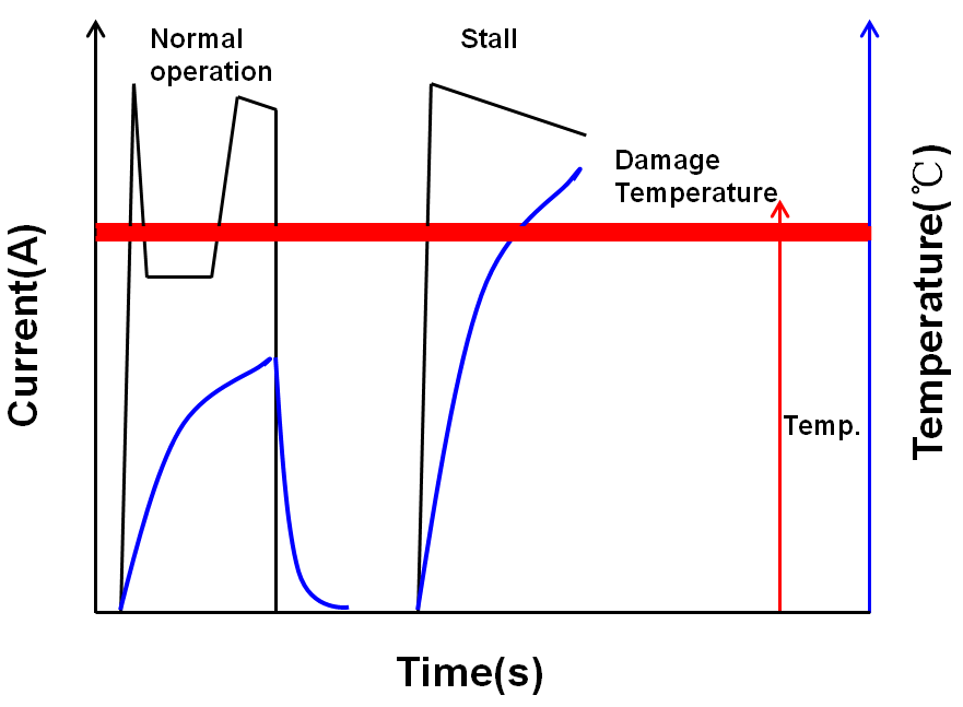 图1 无保护方案的电机电流和温升示意图