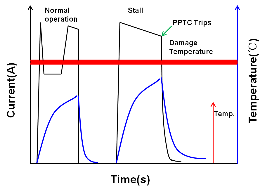 PPTC保护方案是中小型直流电机的主流保护方案之一,其工作特点在于:当电机遇到堵转情况时,PPTC产生焦耳热,热量累计到一定程度后发生动作,切断电机电流,从而达到保护电机的目的。此时,若电机堵转故障一直维持,则PPTC也一直处于高阻状态,从而不会出现反复的“通电-断电”情况,电机温度被一次性抑制到低温状态,如下图2所示。