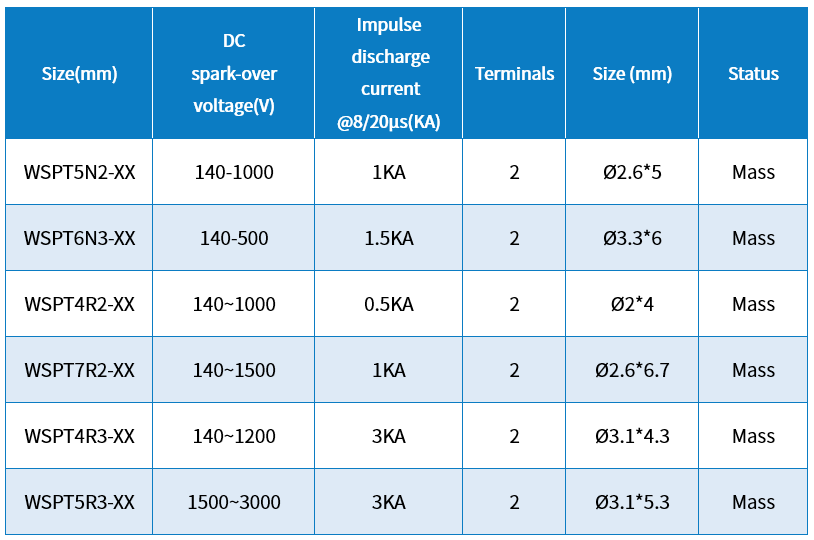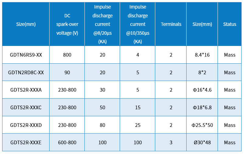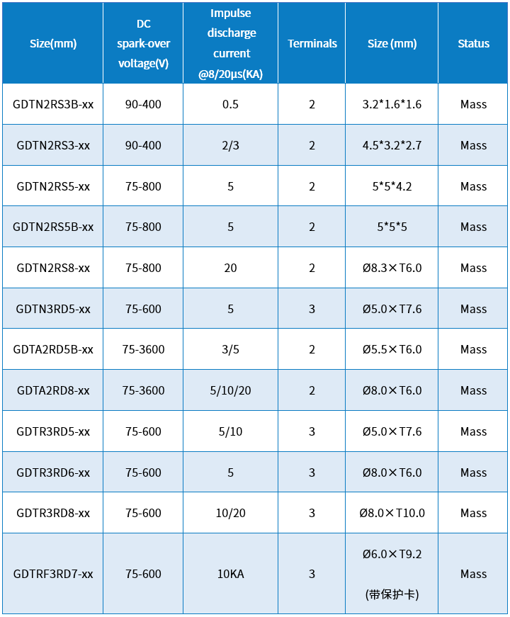 电源类GDT封装和通流多样化,无续流。同时电极可以接受定制。