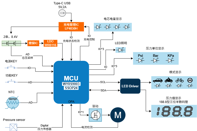 电子打气泵主要由压力传感器、MCU、低噪音马达、充电器等部分组成。当气体容器需要充气时,打气泵的压力传感器会自动感应当前气体压力,并反馈给MCU进行控制。