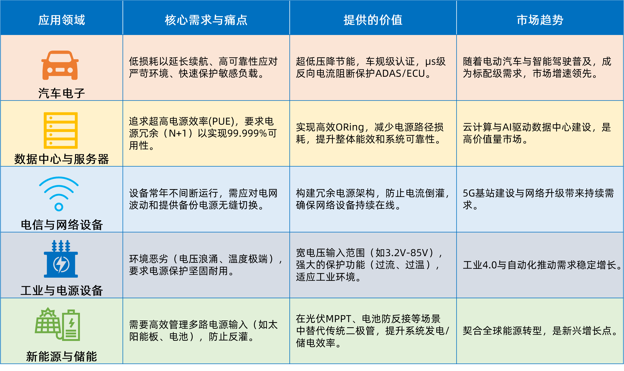 能效革命:全球“碳中和”目标: 中国“双碳”、欧盟“绿色协议”等政策,迫使相关行业在寻求最高效的电源方案以降低能耗。理想二极管控制器可将正向导通压降低至20mV 甚至更低,相较于传统二极管0.3或0.7V的压降,在10A电流下可减少高达97%的功率损耗(从7W降至约0.2W),直接转化为显著的能源节约和更简单的热管理设计。